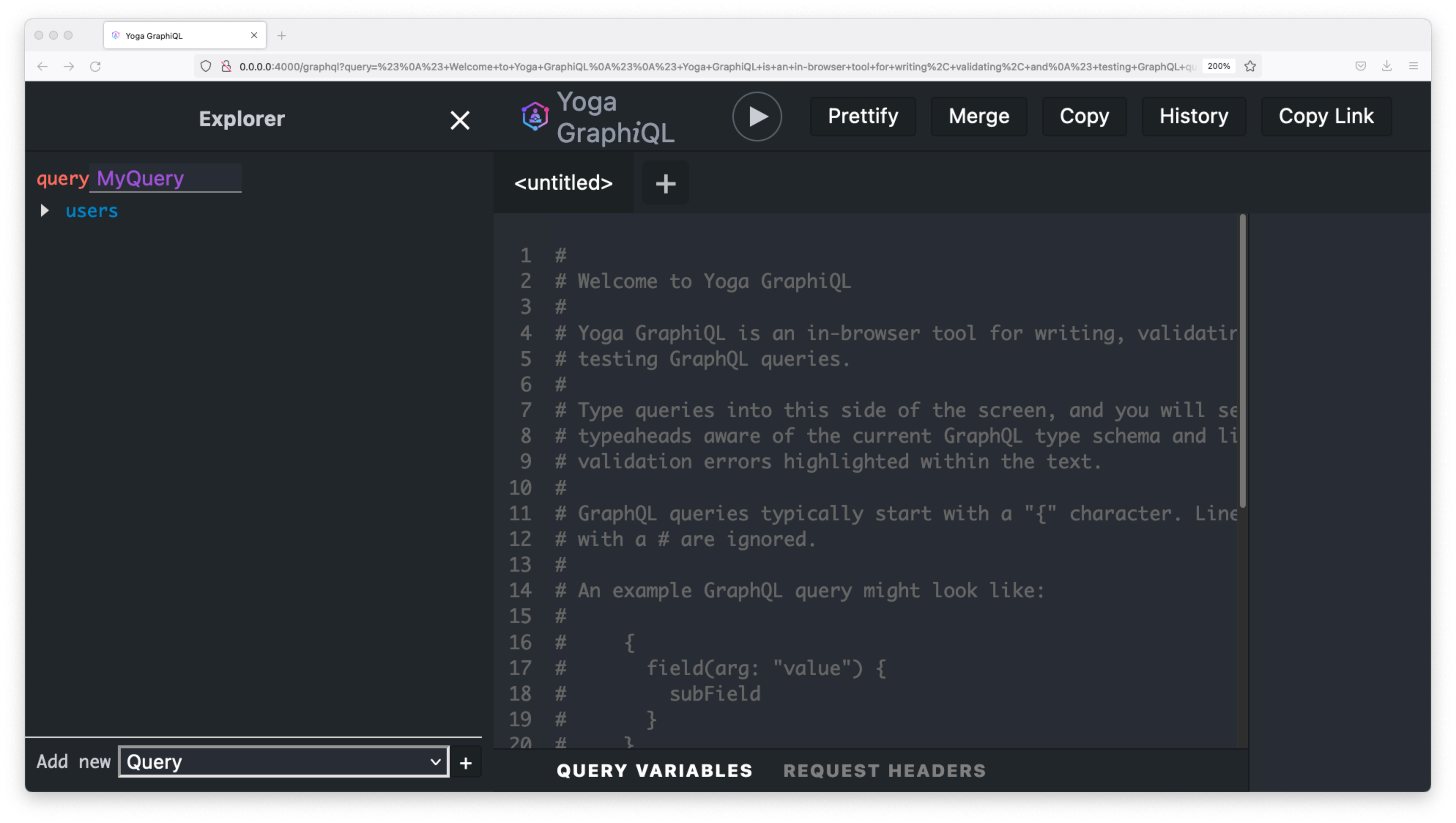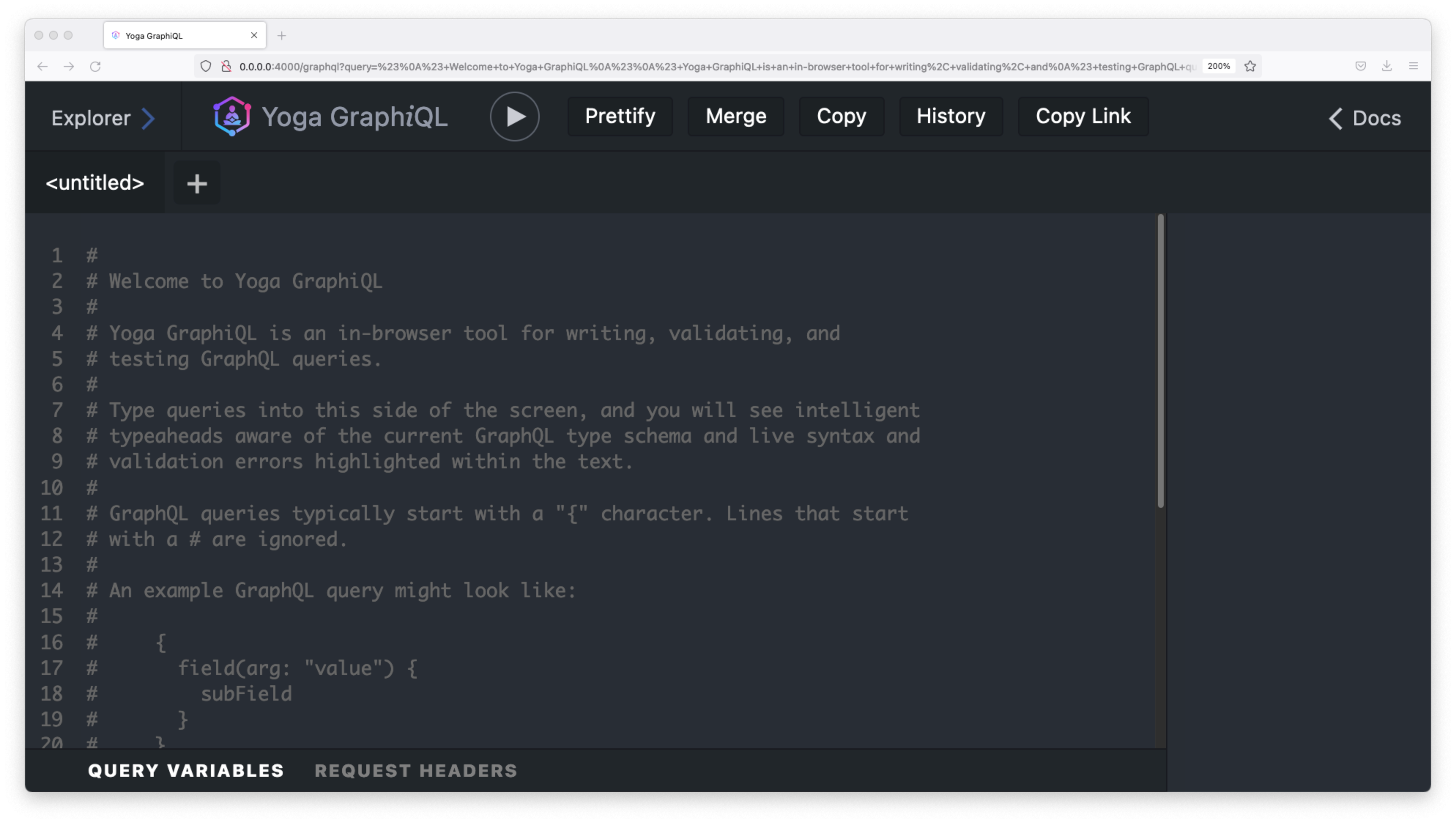 /graphql in your browser to access the GraphQL playground. You should be presented with a page that looks like this: