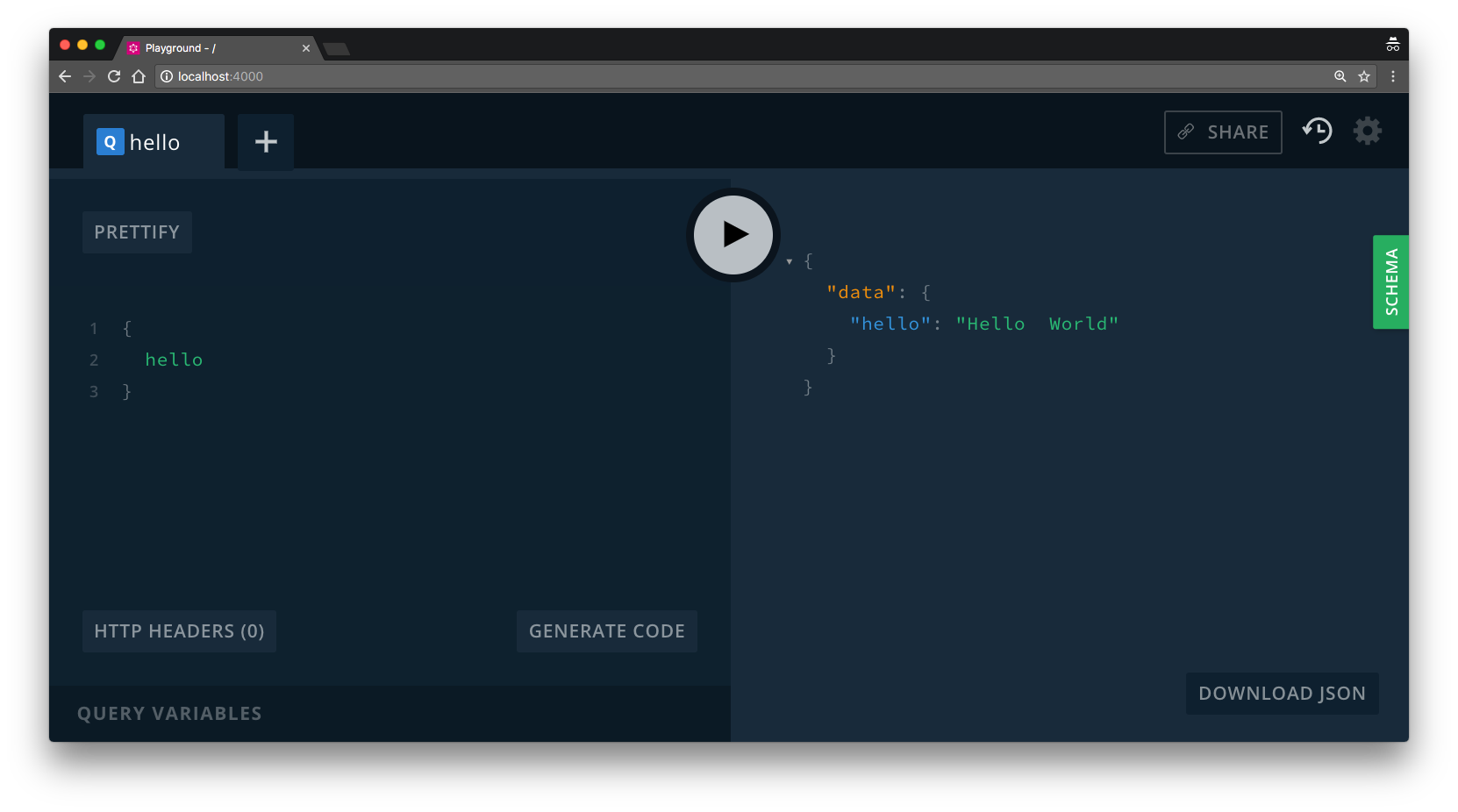 } # responds: { "data": { "hello": "Hello World" } }The new part about this code snippet however is the integrated network layer. Rather than writing a query inline and executing it directly with GraphQL.js (as demonstrated here), this time we’re just setting up the server to wait for incoming queries which can then be executed against the GraphQLSchema.